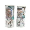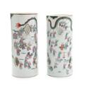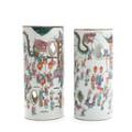 Two Chinese porcelain hat stands with openwork designs, decorated in colours with hundred boys in parade. The one marked Yongzheng, but but 20th century. H. 28 and 28.5 cm. (2)
