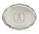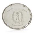 A German Silver dish, of oval form, shallow well engraved with princely crowned A in a laurel wreath for Grand Duchess Alexandra of Mecklenburg-Schwerin and “7. Juni 1904 7. Juni 1929 Bund Ehem 18. Dragoner”, upturned dish rim with curved and lobed-profiled edge. Wilhelm Binder SIlver Ware Factory in Schwäbisch Gmünd, Baden-Württemberg, fineness 800. The 1920s. Weight 1,017 g. L. 45 cm. W 35 cm.