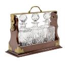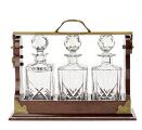 An Edwardian laquered oak tantalus with brass mounts containing three square glass decanters. Early 20th century. H. 33 cm L. 42 cm D. 16 cm.