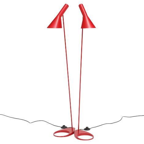 Arne Jacobsen: “AJ”. Et par standerlamper af rødlakeret metal med justérbar skærm. Udført hos Louis Poulsen. (2)