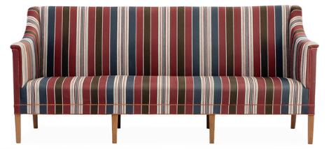 Kaare Klint: Tre-pers. sofa med ben af mahogni. Sæde, sider og ryg med blåt, rødt og hvidstribet græsk Savakuld samt skindkedder.