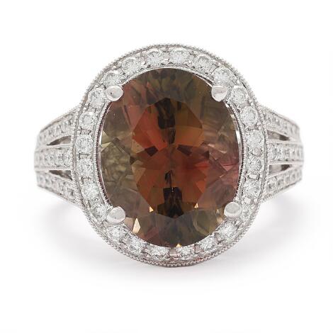 A tourmaline- and diamond ring set with an oval-cut tourmaline and diamonds, mounted in 18k white gold. Size 53.