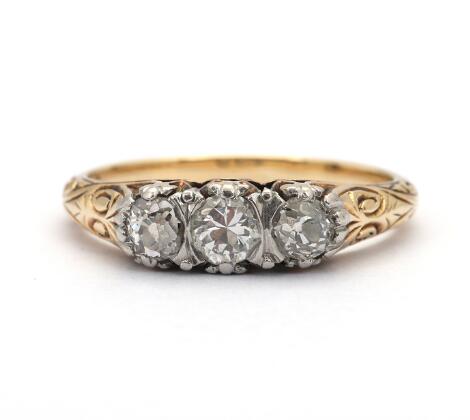 A diamond ring set with three diamonds, mounted in 14k gold and white gold. Weight app. 3 g Size 50.