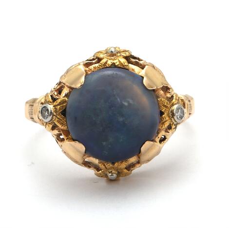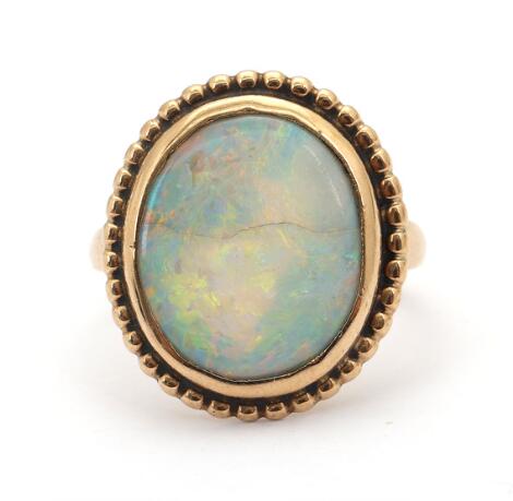 An opal ring set with a cabochon opal, mounted in 10k gold. Weight app. 2 g. W. 17 mm. Size 45.