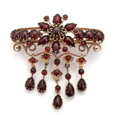 A garnet brooch set with numerous cabochon and pear-shaped garnets, mounted in 14k gold.