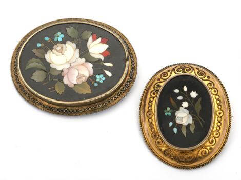 Two brooches each decorated with a floral motif, mounted in gold coloured metal. L. 4.9-5.8 cm.(2)