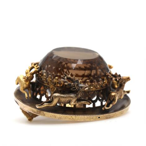 A smokey quartz brooch/pendant set with smokey quartz encircled by red deers. Diam. 5 cm.