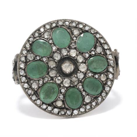 An emerald and diamond ring set with numerous oval-cut emeralds and rose-cut diamonds, mounted in silver. Size 58.