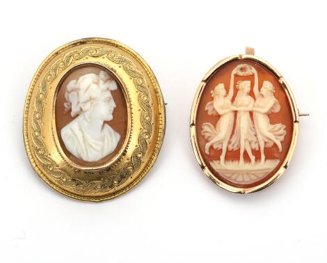 A cameo brooch/pendant and a -brooch set with a carved cameo, mounted in 11k gold and gilded metal. (2)