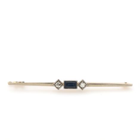A sapphire- and diamond brooch set with sapphire and diamonds, mounted in 14k gold. L. 6.2 cm.
