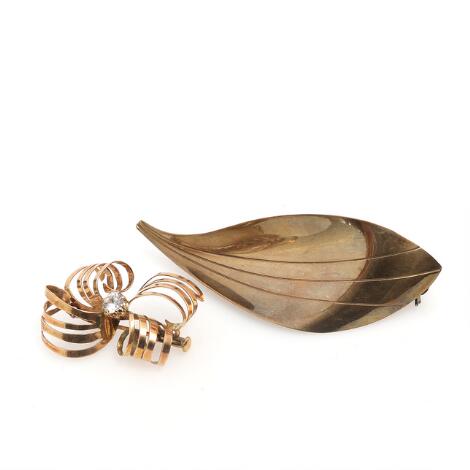 Two brooches respectivly of 8k- and 14k gold. L. 3-6.2 cm. (2)