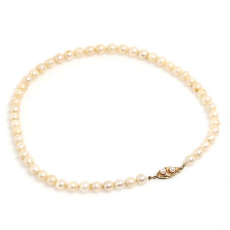 A pearl necklace set with numerous pearls, mounted with clasp of 14k gold. L. 40 cm.