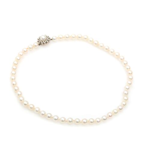 A pearl necklace set with numerous pearls, set with pearl and diamond clasp, mounted in 14k white gold. L. 44 cm.