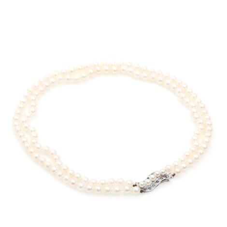 A two strand pearl necklace set with numerous pearls set with sapphire- and pearl clasp, mounted in 14k white gold. L. 43 cm.