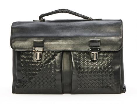 Bottega Veneta: A briefcase of black partly woven leather with silver tone hardawre and short handle.