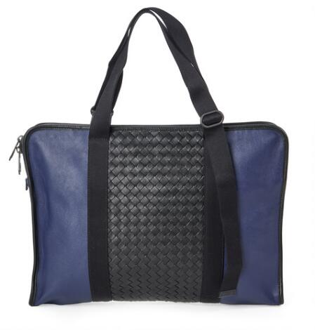 Bottega Veneta: A briefcase of dark blue leather and partly black woven with black hardware.