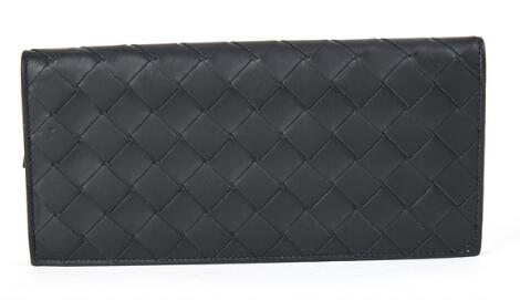 Bottega Veneta: A wallet of black woven leather with black hardware and one zipped compartment.