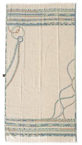 Hermès: A scarf of cashmere with blue, green and brown motifs on beige background. App. 92 x 175 cm.