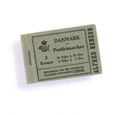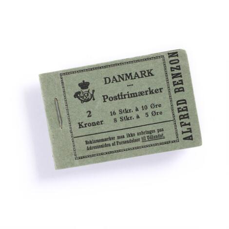 1933. Alfred Benzon. Komplet hæfte hvor posttakster på 3. omslagsside er annulleret ved overtrykning af violette bjjælker. Mærkerne noget alderspræget. Sjældent