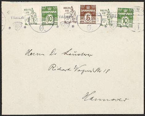 MOHAWK DÆK. All in all 3 pairs with 2 x 10 øre, green and one 5 øre, brown on entire from KØBENHAVN 8.9.28 to Hannover.
