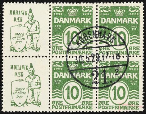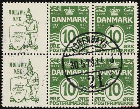 1928. Mohawk Dæk, 10 øre, green. Block of 6 with variety "LINE OVER ØRE". Canc. København 30.5.29. AFA 8.000. Cert. Nielsen