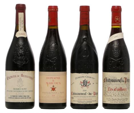 1 bt. Chateauneuf du Pape "Chateau de Beaucastel", Famille Perrin 1999 A (hf/in). etc. Total 4 bts.