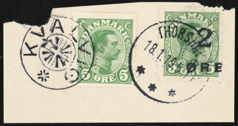 1919. Chr. X, 2/5 øre + 5 øre, variant "FORSKUDT OVERTRYK". Mærker på brevstykke med først 5 øre afstemplet med stjernestempel KVALVIG og sanere påsat 2/5 øre