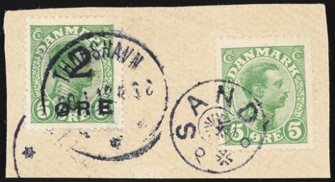 1919. Chr. X, 2/5 øre + 5 øre. Brevklip med 5 øre annulleret med stjernestempel SAND og opfrankeret med 2/5 øre afstemplet THORSHAVN 20.1.19 (kendes 4 breve og