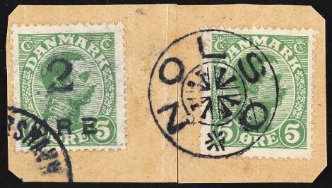 1919. Chr. X, 2/5 øre + 5 øre. Klip med 5 øre, annulleret med stjernstempel NOLSØ og OPFRANKERET med 2/5 øre i Thorshavn. Klip sammensat. 1 af kun 2 kendte klip