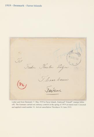 1919. Brev fra Danmark stemplet CHARLOTTENLUND 17.5.1919 sendt til Færøerne med blå påskrift "Frimaff" (frimærke faldet af). Gået gennem tysk censur. Sjældent b