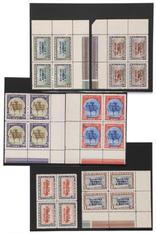 1945. Ændrede farver. Komplet sæt i 4-blokke med marginaler i postfrisk kvalitet. (30 øre uden marginal).