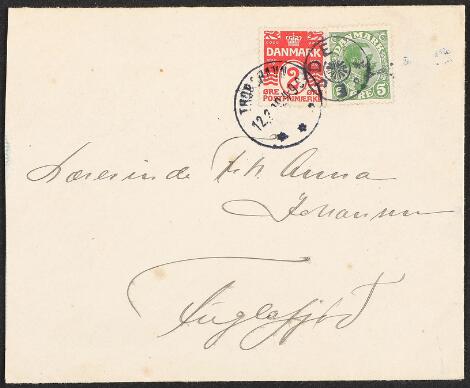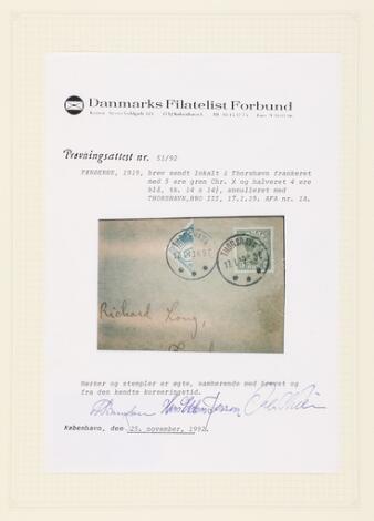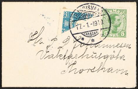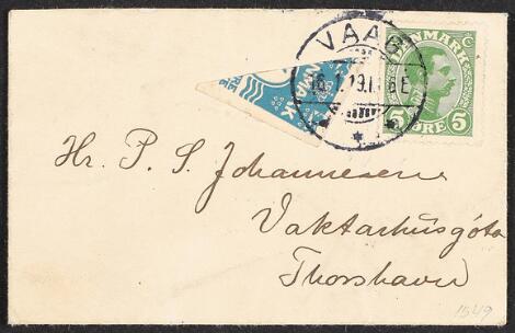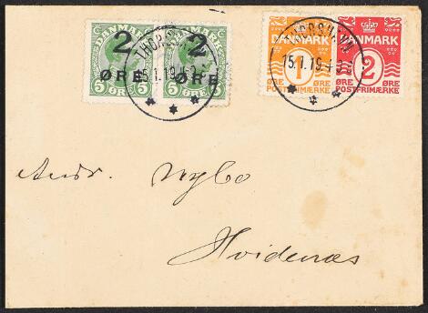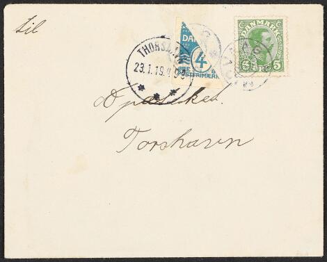 1919. Halveret 4 øre samt Chr. X, 5 øre, på lokalbrev med først afstemplet Chr. X THORSHAVN 17.1.19.9-2E og senere samme dag påsat halveret 4 øre og afstemplet