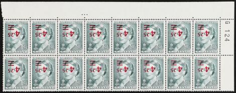 1996. Overprint, 4,25/0,25 kr. green/red. INVERTED OVERPRINT. MNH block of 16 with corner margin. We have not offered larger than blocks of 4 before, possible u