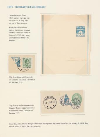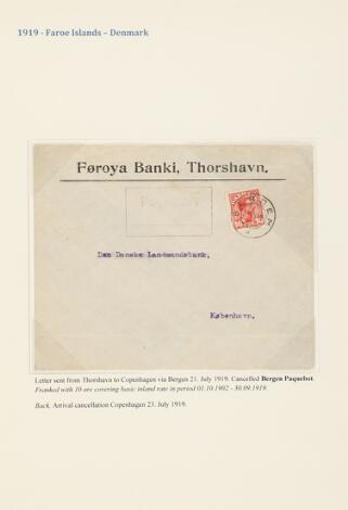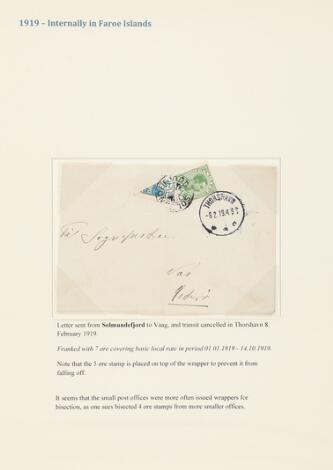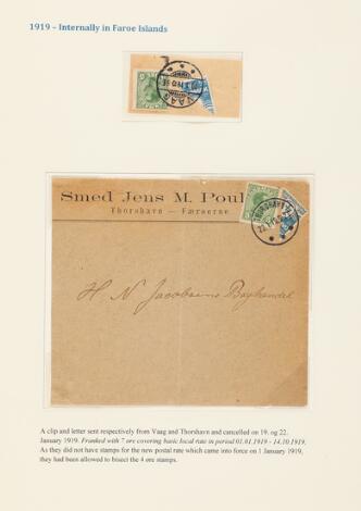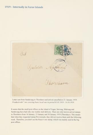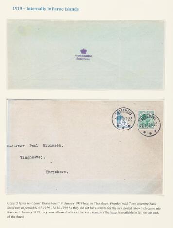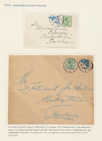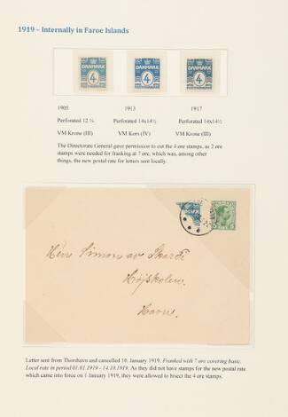 1919. Side fra specialsamling med bl.a. PRAGT-brev med halveret 4 øre samt 5 øre stemplet THORSHAVN 10.1.1919