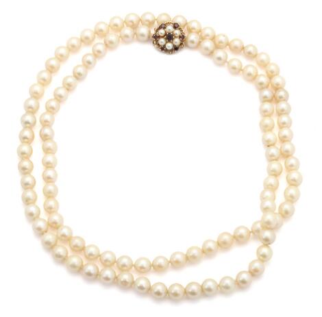 A long pearl necklace set with numerous cultured pearls and a pearl and garnet clasp of 9k gold. L. 84.5 cm.