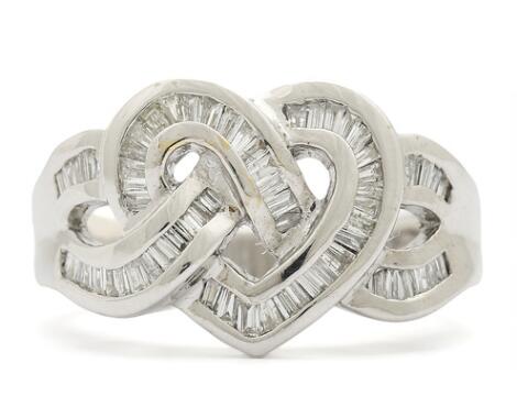 A diamond ring set with numerous baguette-cut diamonds in the shape of a heart, mounted in 18k white gold. Size 55.