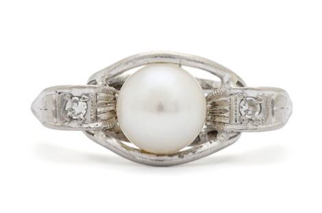 A pearl and diamond ring set with a cultured pearl flanked by two diamonds, mounted in 18k white gold. Size app. 51.