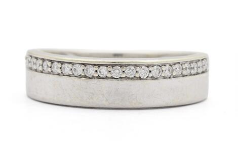 A diamond ring set with numerous brilliant-cut diamonds, mounted in 14k white gold. Size 53.