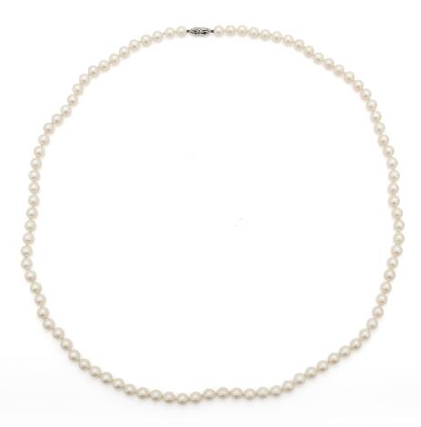 A pearl necklace set with numerous pearls and a diamond clasp of 14k white gold. Pearl diam. app. 6 mm. L. 74 cm.