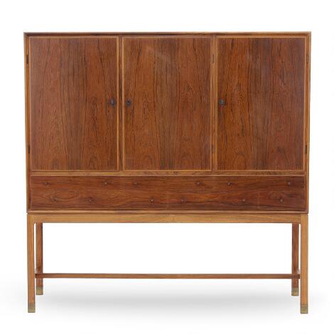 Preben Birch: Dækketøjsskab af riopalisander med messingsko. Front med syv skuffer og tre døre.