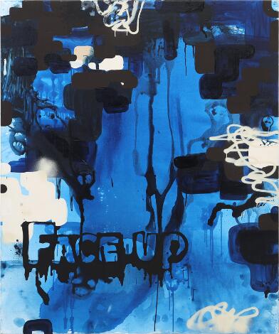 Melou Vanggaard: "Face up", 2007. Signeret på bagsiden. Olie på lærred 165 x 137 cm. Uindrammet.