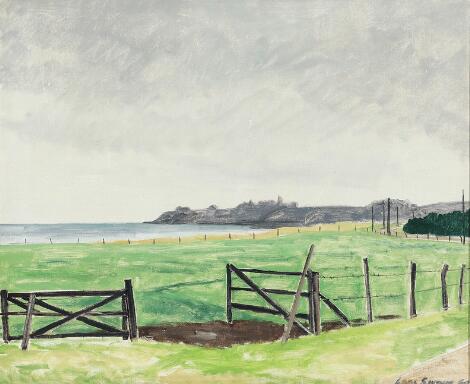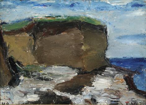 Jeppe Vontillius: Kystlandskab ved Knudshoved. Signeret I.V. 49; signeret på bagsiden. Olie på plade. 23 x 33 cm.