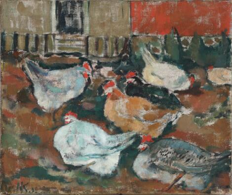 Ubekendt kunstner: Hønsegård. Signeret NK 55. Olie på lærred. 50 x 60 cm. Uindrammet.
