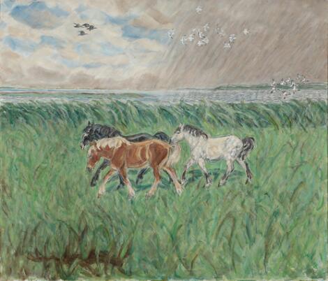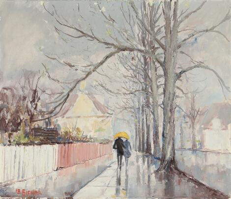 Knud Kyhn: "Regnvejr...", 1967. Signeret og dateret monogram; signeret, med titel og datering på bagsiden. Olie på lærred. 77 x 93 cm.