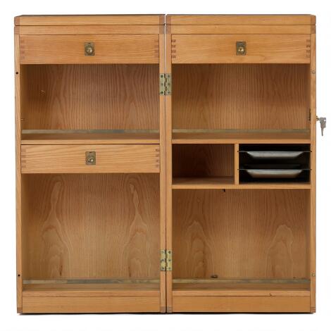 Dyrlund: “Captains bar”. Bar af ask, monteret på hjul. Udklappelig top ilagt sort formica. H. 90. B. 59. D. 45.