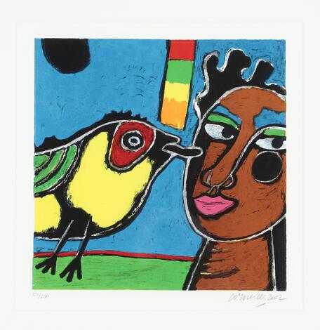 Corneille: "La femme et l'oiseau I", 2002. Signeret Corneille, 64/200. Litografi i farver. Lysmål 34 x 34 cm.