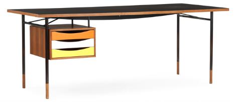 Finn Juhl: "Nyhavn". Skrivebord med ben af stål, "sko" og kant af valnøddetræ. Top med sort linoleum.