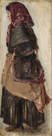 Hans Smidth: Study of a poor woman. Signed H. Smith. Oil and pencil on canvas laid on cardboard. C 30 x 12 cm.