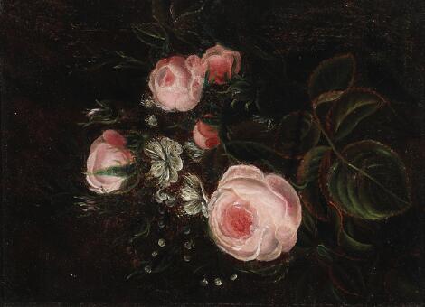 I. L. Jensen, school of, 19th century: A bough of pink roses with dew drops on the leaves. Signed and dated B. B. 1842. Oil on cardboard. 20.5 x 17 cm.