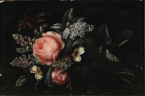I. L. Jensen, school of, 19th century: Still life with roses and pansies. Signed with monogram. Oil on mahogany. 16 x 24 cm.